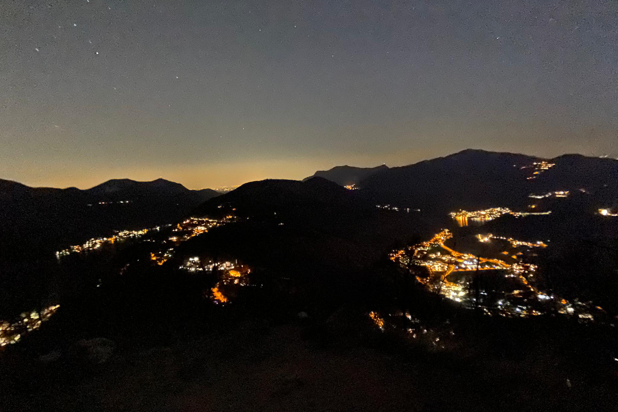 Am meisten geblasen hat es am höchsten Punkt, auf dem Dach der Kirche. Für Rundum Ausblick lohnt es sich aber dennoch. Ich hätte weniger Häuser und mehr Natur erwartet. Es wurde immer später und die Frage des „Wo stelle ich das Zelt hin“ tauchte auf. Ein wenig unter dem Restaurant fanden wir eine geeignete (Windig war es überall) Stelle. Wie schon oft, fragte ich mich in welche Situation ich uns jetzt wieder gebracht habe. Die letzte Bahn war schon abgefahren und der Weg vom Berg herunter hätte uns zwei Stunden gekostet. Also stellte ich so schnell wie möglich das Zelt auf und richtete es ein. Unterdessen war Jason beschäftigt mit Brennholz sammeln. Es war so kalt das wir uns alle mitgebrachten Kleider überzogen und erstmal eine Suppe kochten. Endlich konnte ich entspannen und meine Gedanken dem Ausblick widmen. was für ein Glück wir hatten. Keine Menschenseele war zu hören. Der Sonnenuntergang schenkte uns einen blau, violett, roten Himmel. Von unserem Platz aus, waren die Berge noch lange zu sehen. Um warm zu haben verzogen wir uns ins Zelt. Minus 6°C sollte es werden in der Nacht. Mein kleiner Mann schlief schnell ein und ich genoss die Ruhe. Als es ganz dunkel war kletterte ich aus dem Zelt um die Sterne zu sehen. Der Himmel war Sternenklar und die Lichter der Dörfer und Städte leuchteten in verschiedensten Farben. Traumhaft.