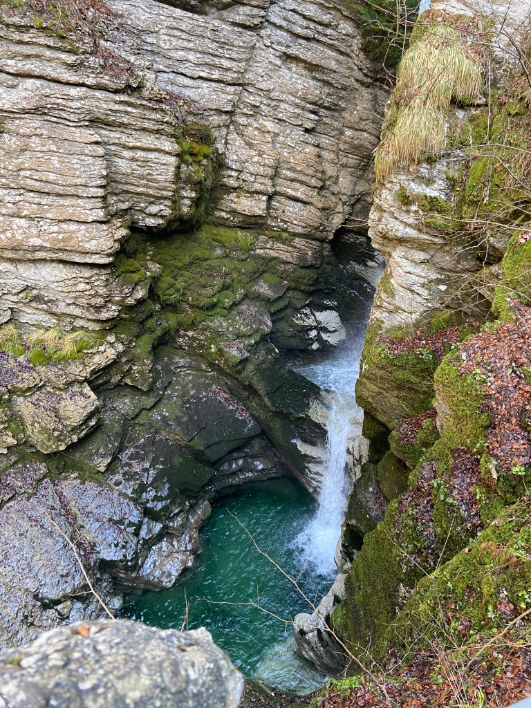 Der Morgen war eiskalt. Ich hatte die kalte ein wenig unterschätzt also stand Morgensport auf dem Programm um uns zu wärmen. Eichhörnchen leisteten uns Gesselschaft. Wir rannten bis uns warm war und genossen danach eine leckere, heisse Suppe. Der mini Gas Kocher ist auf jeder Tour dabei. Endlich ging es zu den Wasserfällen. Der Weg führt über Treppen, durch eine Höhle. Das plätschern des Wassers ist überall zu hören. Das Wasser fliesst in ein Natur Becken mit tiefblauem Wasser.